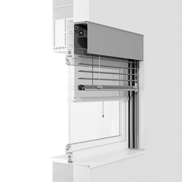 Sie wollen alle Vorteile eines Vorbausystems und die eines klassischen Fassadenraffstores gleichzeitig? Dann ist das MODULO Raffstorensystem von ROMA die richtige Wahl. Ob als eingeputzte Variante vollständig in die Fassade integriert oder sichtbar mit einer Blende – MODULO ist vielseitig einsetzbar.